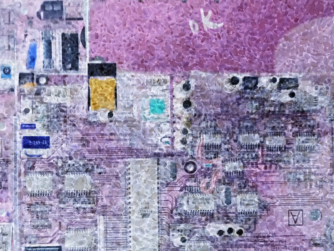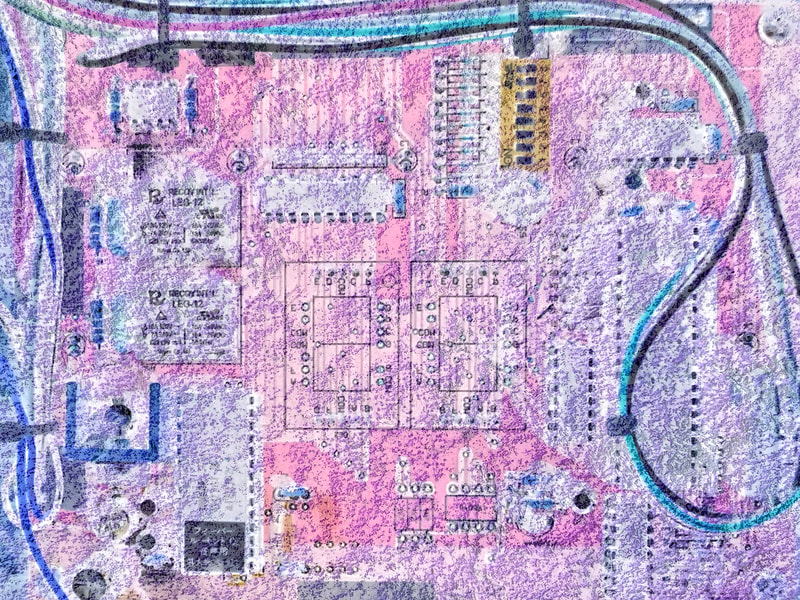 Be No.21 - The moss on a rock in a brook and the circuit board of a pinball machine.