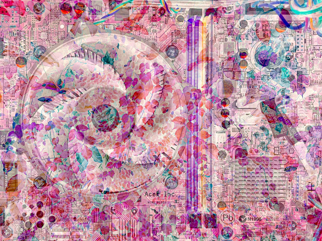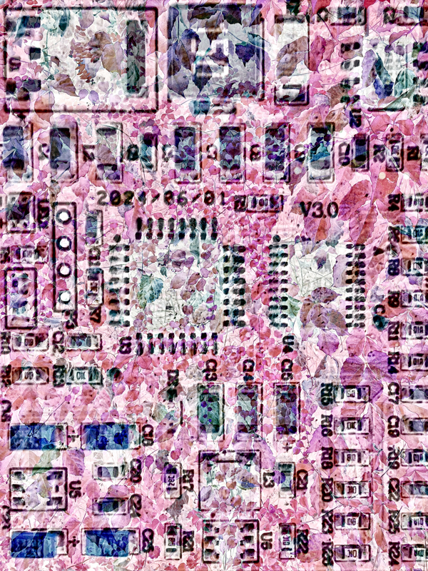 第二個探索則嘗試將科技產品的內部構造與自然元素融合在一起;前者象徵我作為工程師的理性面,而後者代表我作為藝術家的感性面。理性與感性經常在我的自我實現旅程中產生衝突,而我試圖將兩者視覺化並融合在一起,就像我努力讓這兩個面向在我的生命中能夠共存共榮。